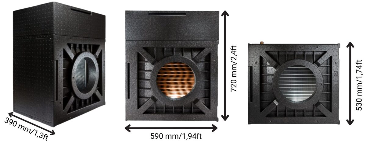 The geothermal pre-conditioning heats intake air in winter and cools it in summer, serving as a frost protection component for ventilation units. The brine in the geothermal heat collector absorbs soil temperature and transfers it to the intake air within the unit's heat exchanger. The complete unit (heat exchanger with “A” class circulation pumps and safety unit in insulated EPP housing) is activated by a temperature-controlled controller (not included). A G4 filter is integrated, with front and top doors for easy access and maintenance.